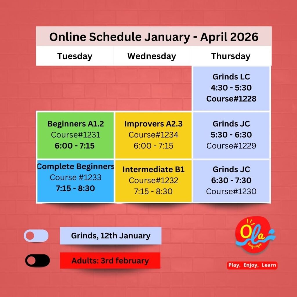 Ola Languages offers a diverse selection of in-person group classes for adults, catering to all proficiency levels. From complete beginners and beginners to elementary and advanced students. Morning, afternoon, and evening groups classes.